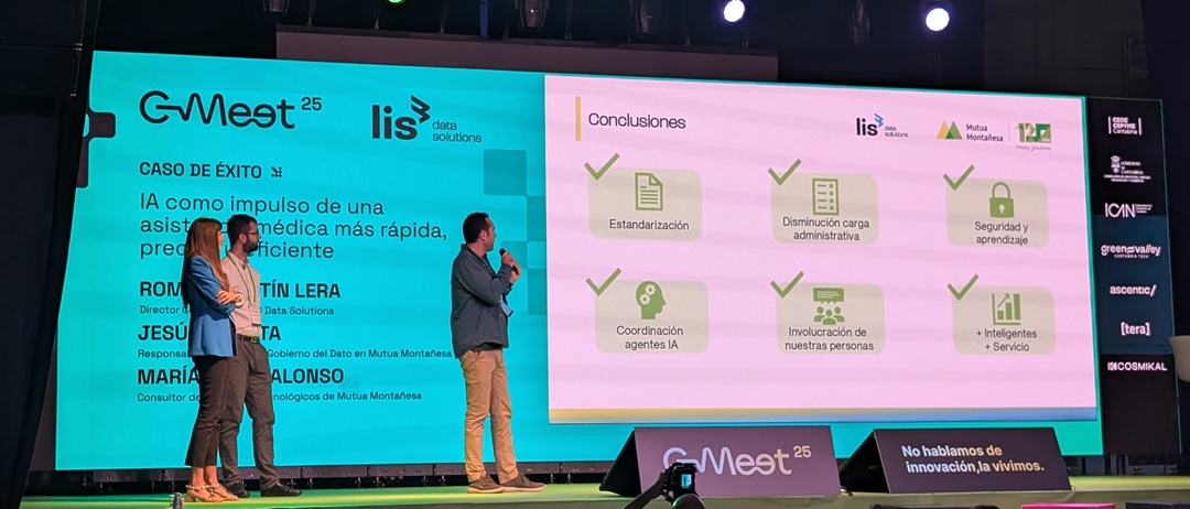 Nuestros compañeros Maria Elena Alonso Miguel, responsable de Calidad y Gobierno del Dato, y Jesús Villota, consultor de Proyectos Tecnológicos de Mutua Montañesa, presentaron junto a Román Martín Llera, de LIS Data Solutions ES | Data for Change, un proyecto pionero en el uso de IA generativa en el sector sanitario.